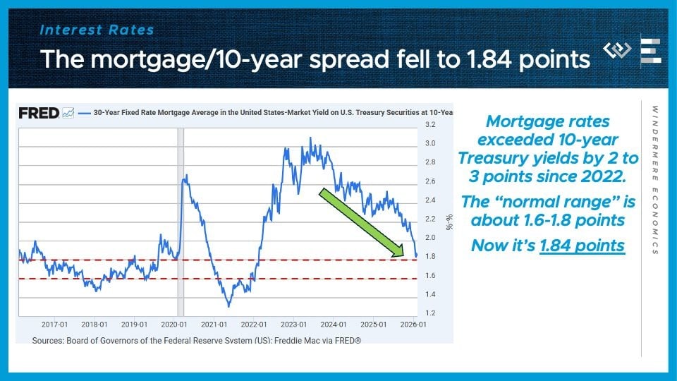 The third number to know right now: 1.84 percentage points. That was the average spread, or how much higher 30-year mortgage rates were than the benchmark 10-year Treasury yield in the first week of February. That means we are knocking at the door of a normal spread after almost four years of a really abnormally wide spread. This was a major culprit in the pain that homebuyers felt trying to get a mortgage. Last month I talked about the surprise announcement that Fannie Mae and Freddie Mac would be buying mortgage-backed securities, and I think the proof is in the pudding that the news of that purchasing plan helped bring this spread down by that last 30 basis points just in the last month.